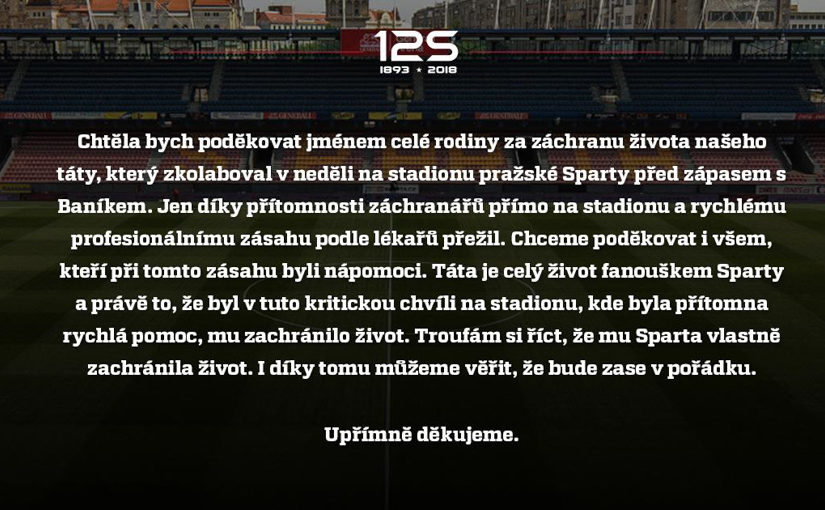 Sdílíme články z médií o úspěšné záchraně života na stadionu AC Sparta, včetně veřejného poděkování rodiny (Příspěvek z TWITTER AC Sparta Praha):